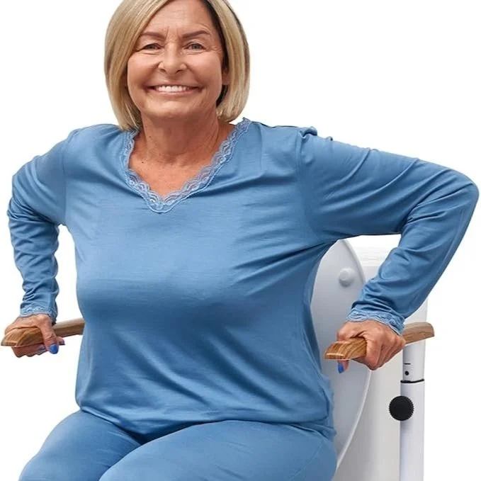 A toilet riser with handles that makes sitting on the toilet easy.